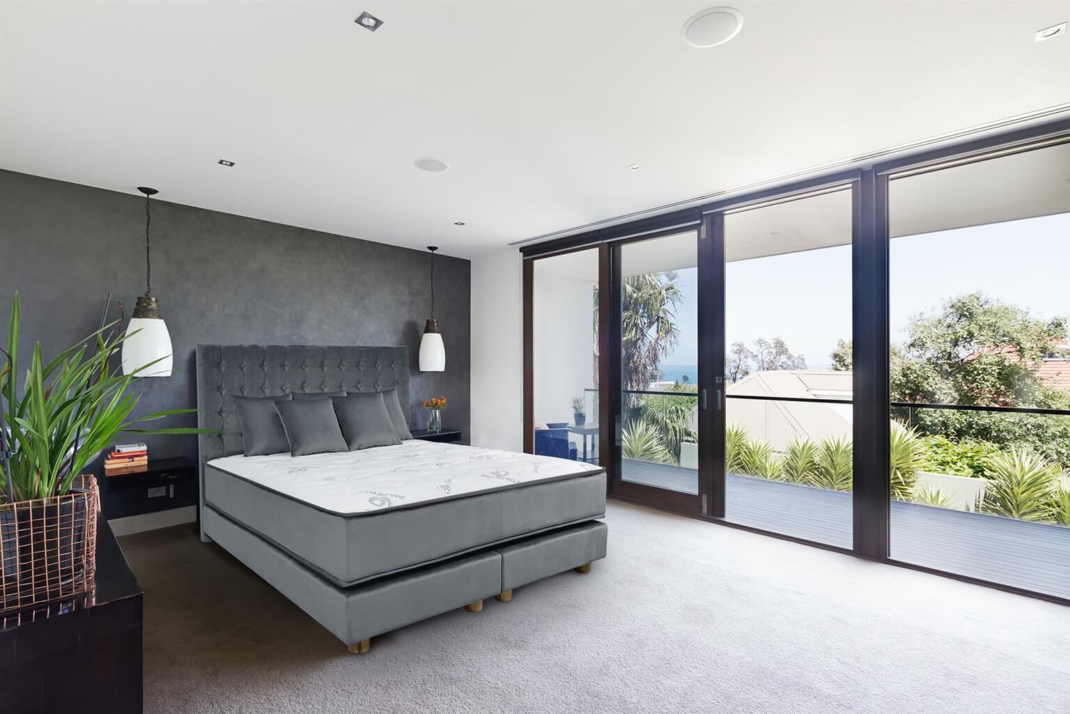 1. Cel mai important aspect este bineinteles, patul, poarta catre bunastare si elementul central al dormitorului. Ce tip de pat sa aleg? Propunerea noastra este patul tapitat de tip boxspring. Constructia de lemn a acestuia confera rezistenta si durabilitate, materialele naturale atent alese precum si catifeaua fina care imbraca salteaua si cadrul boxspring-ului, ofera o experienta a somnului desavarsita.